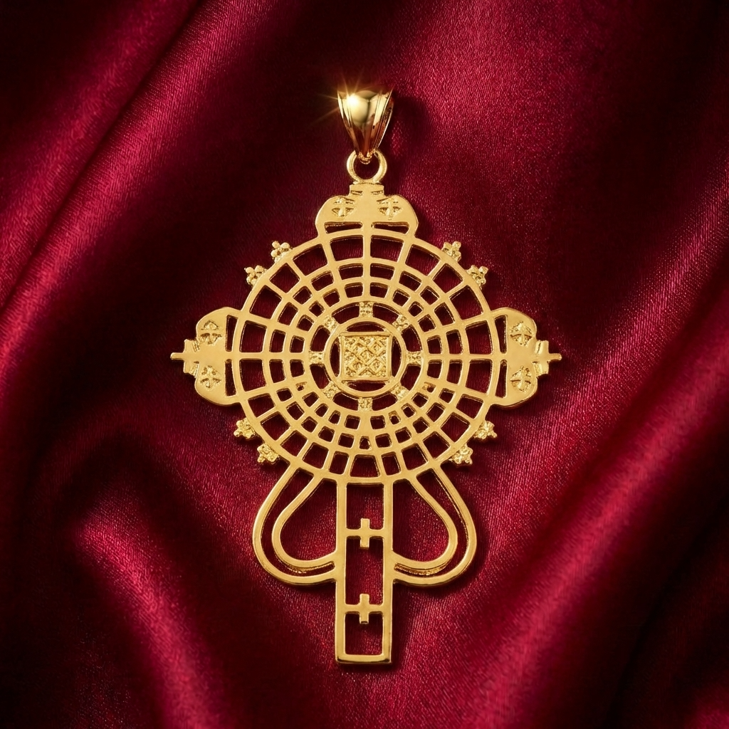Command attention and honor your heritage with this breathtaking, statement-making jewelry collection. At the heart of this three-piece set is a magnificent Meskel (መስቀል), showcasing an intricate circular grid and traditional looping base that masterfully captures the essence of historic Ethiopian Orthodox Tewahedo metalwork.